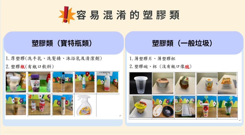 - 塑膠類(回收):寶特瓶、有瓶口飲料瓶、厚塑膠容器(如洗手乳、洗髮精、沐浴乳)